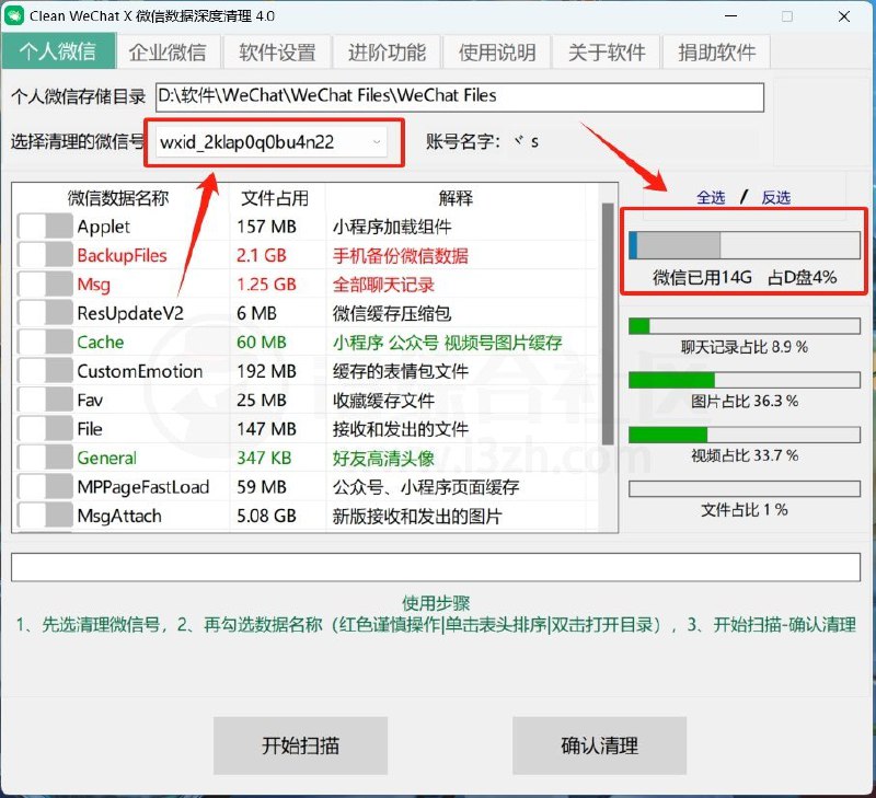 Clean WeChat X – 微信数据深度清理,打开后,会自动显示电脑中微信的存储目录,可以自动扫描出你的微信号。如果你有多个微信号,只需下拉选择即可切换,十分方便。