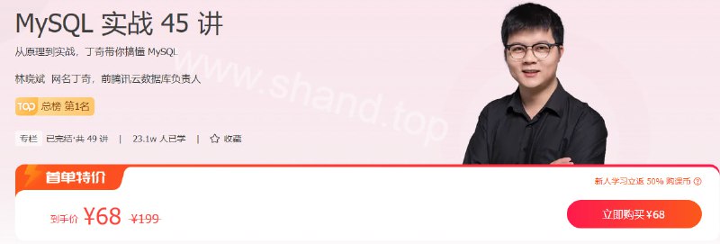 极客时间的《MySQL实战45讲》是一门深度解析MySQL数据库实战技巧的课程,涵盖索引优化、事务处理、锁机制、性能调优、高可用架构等核心内容,通过实战案例讲解,帮助学员全面掌握MySQL使用与优化技能,提升数据库管理与运维能力。