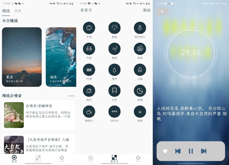 白噪音睡眠放松APP是一款让您能让您学习更专注,睡眠更香的背景白噪音APP。宝宝哭闹时,学习工作时,冥想放松时,晚上睡觉时,您都可以用到它。