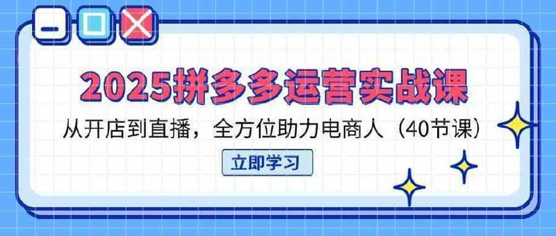 《2025拼多多运营实战课程40节》是一套全面的拼多多电商运营教程,包含40节课程,涵盖店铺搭建、选品策略、流量获取、推广技巧、数据分析及客户服务等内容。课程结合最新平台规则和实战案例,帮助学员快速掌握拼多多运营核心技能,提升店铺竞争力,实现高效变现。