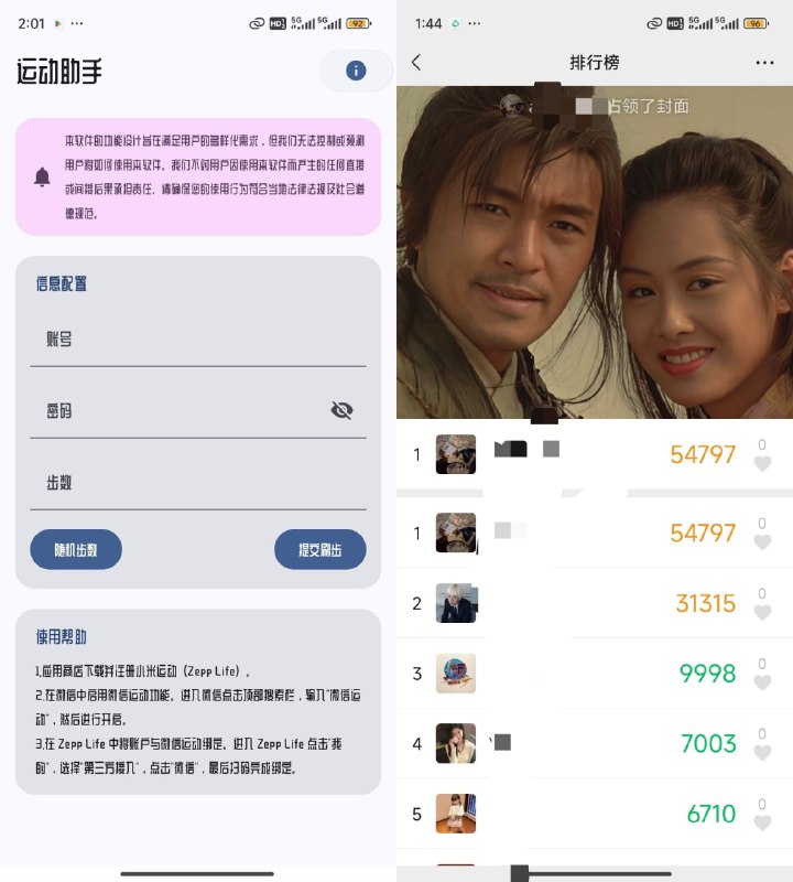 支持数据秒同步支付宝、微信,一键修改QQ运动、微信运动的步数,让你在家足不出户也能走几万步使用说明1.下载并注册网盘里的(小米运动Life)。2.在微信中启用微信运动功能。进入微信点击顶部搜索栏,输入“微信运动”,然后进行开启。3.在 Life 中将账户与微信运动绑定。进入 Life 点击”我的”,选择”第三方接入”,点击”微信”,最后扫码完成绑定。4.打开“运动助手”,提交你的账号数据以及步数