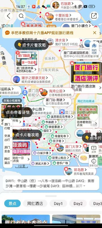 十六番是旅游好搭子,通过游记、问答等提供旅行解决方案。其懒人地图功能强大,能标记景点、美食等,还提供推荐路线