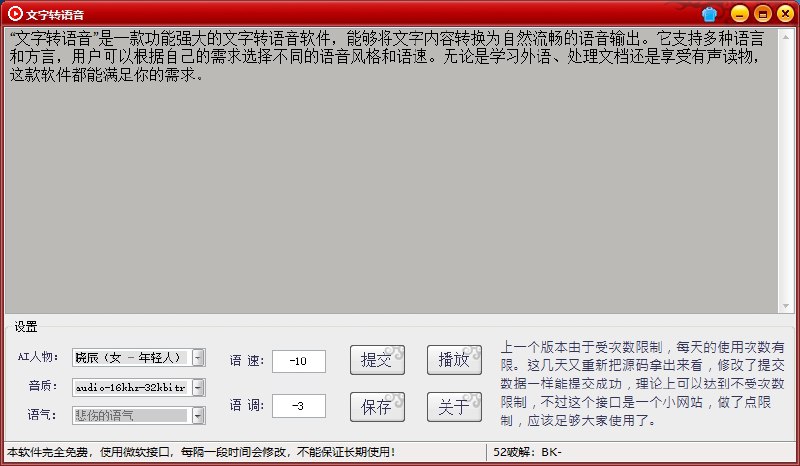 文字转语音”是一款功能强大的文字转语音软件,能够将文字内容转换为自然流畅的语音输出。它支持多种语言和方言,用户可以根据自己的需求选择不同的语音风格和语速。无论是学习外语、处理文档还是享受有声读物,这款软件都能满足你的需求。软件的界面设计简洁明了,操作流程直观易懂。软件的主界面以文字输入框为核心,用户可以轻松输入或粘贴需要转换的文字内容。在输入框下方,提供了语音播放、暂停、停止等基本控制按钮,用户可以轻松控制语音输出……